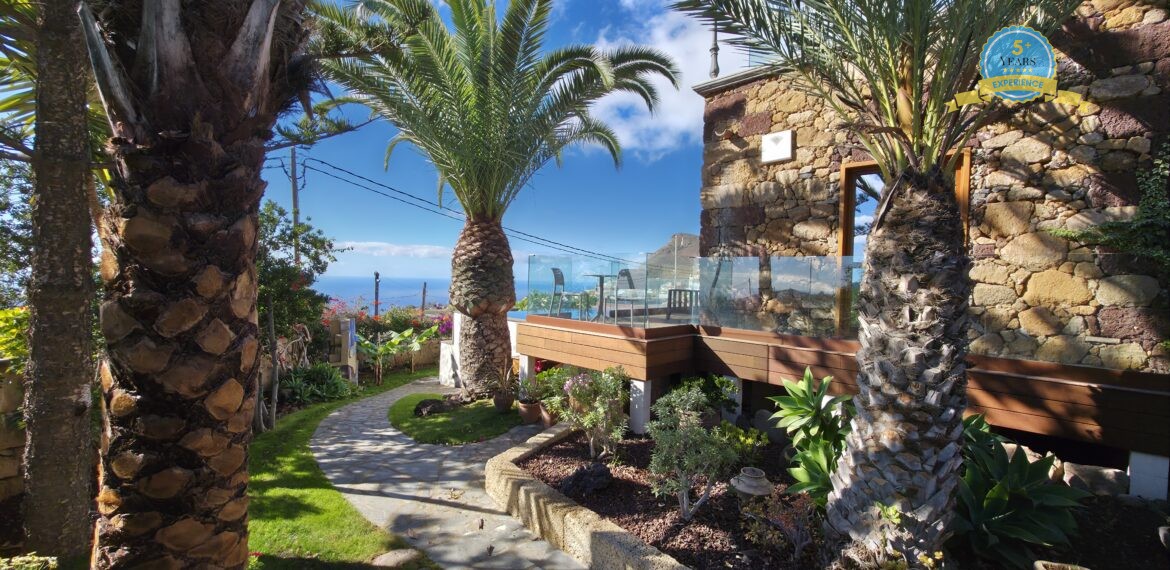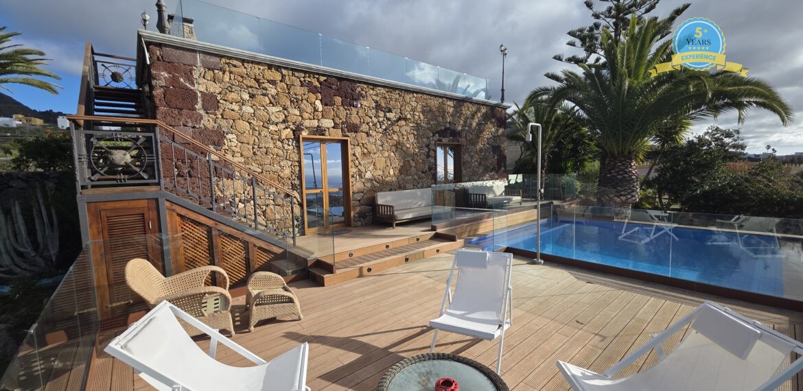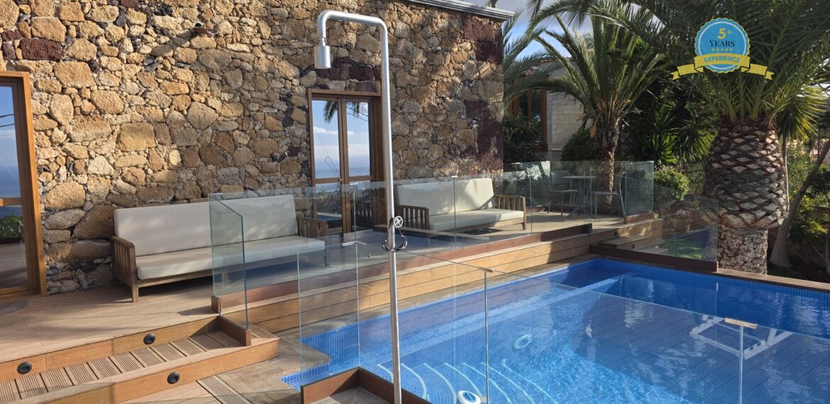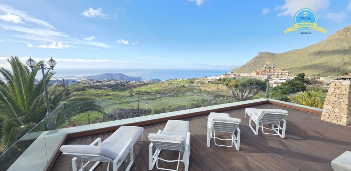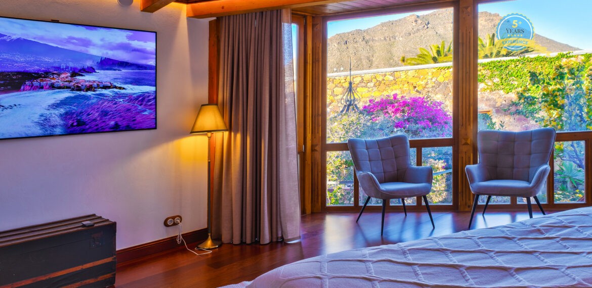 Spacious Accommodation: Villa Serenitas in Arona offers six bedrooms and six bathrooms, complemented by a spacious living room. Guests enjoy sea, garden, and pool views from the terrace and balcony.
